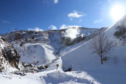 下記写真左の湯畑へ行く道は雪が50cm以上で進めません。