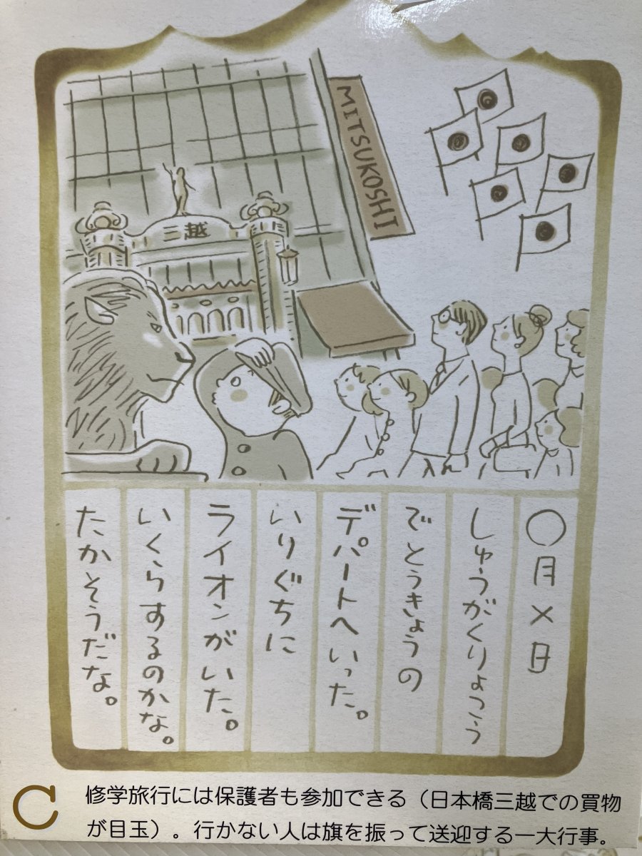 修学旅行には保護者も参加できる(日本橋三越での買い物が目玉)。行かない人は旗を振って送迎する一大行事